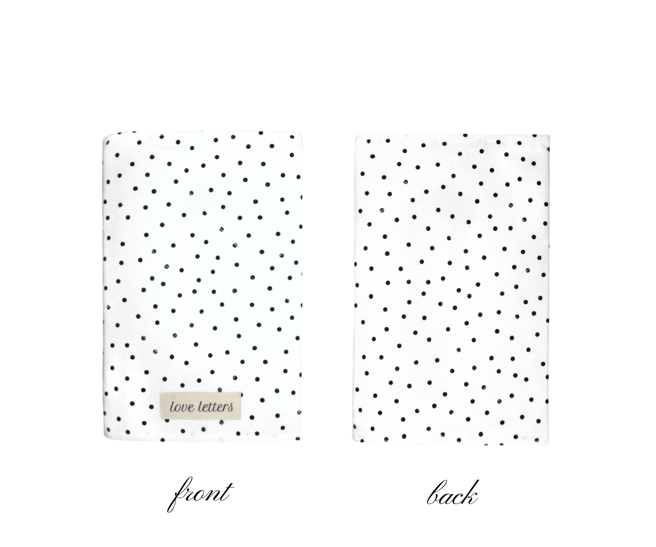 Spotless Bride is made with a cotton white & black polka dot fabric, white cotton lining and white ribbon details.